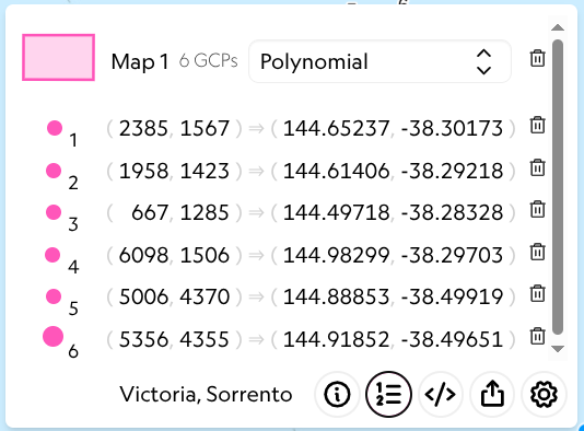 If you make a mistake while adding GCPs, don't worry! Click on the list icon at the bottom of the editor screen to display all the current points. Click on the delete icon to remove any mistakes.