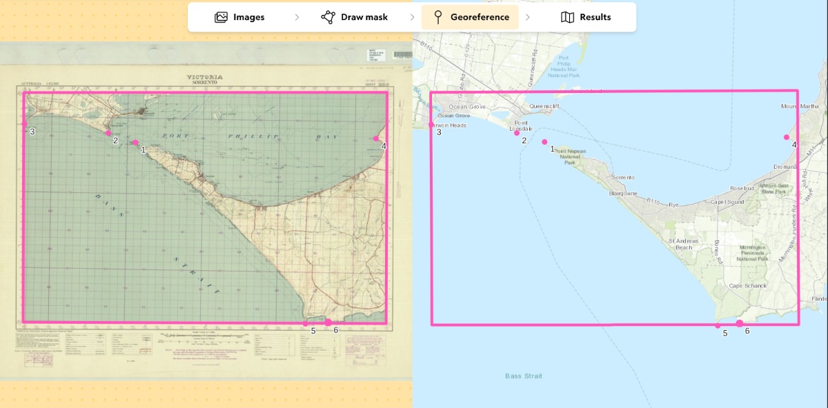Georeferencing (or georectifying) relates a digitised map to real world geography. It describes the map's position and extent using geospatial coordinates – turning historic documents into geospatial data that can be visualised, indexed, and manipulated.
