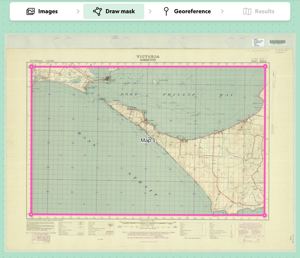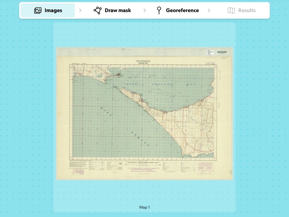 The AllMaps Editor has four panes – Images, Draw mask, Georeference, and Results. It opens in the Images pane. If you're georeferencing a single map, there may only be one image. But if you're working on an atlas or street directory might be many images. Click on an image to select it, then click on the Draw mask tab.