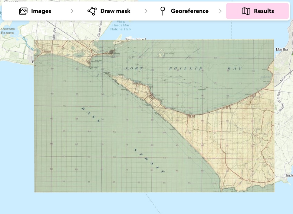 The Results pane displays the digitised map as an overlay on top of the modern basemap. The GCPs are used to align the digitised map with modern coordinates, so the map will often appear skewed or warped.