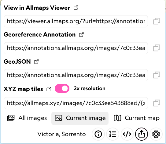 If you're georeferencing an item that includes multiple maps, click on the All images tab at the bottom of the share options. If you click on the open viewer link now, you'll see all the georeferenced maps in the current item.