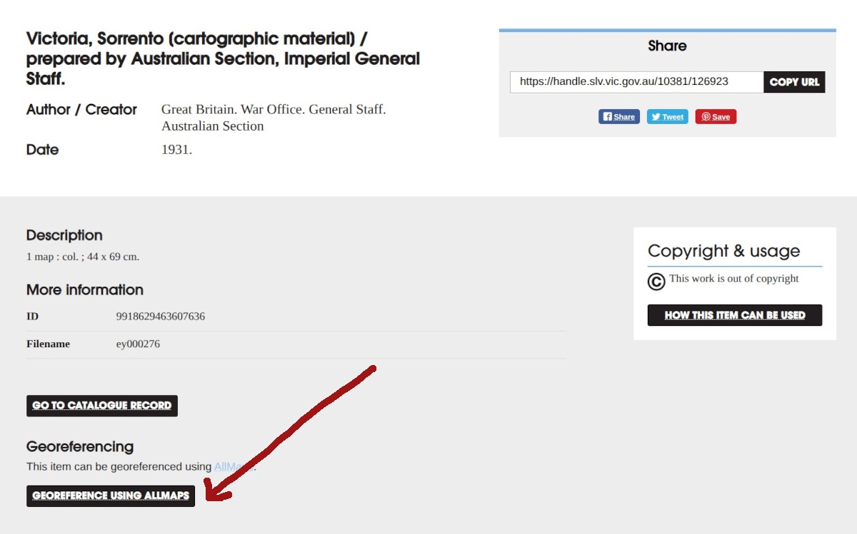 We're using AllMaps to georeference digitised maps from the SLV collection, and a userscript to connect the SLV to AllMaps. If you understand the basics of georeferencing and just want to get to work, here's what you need to do: