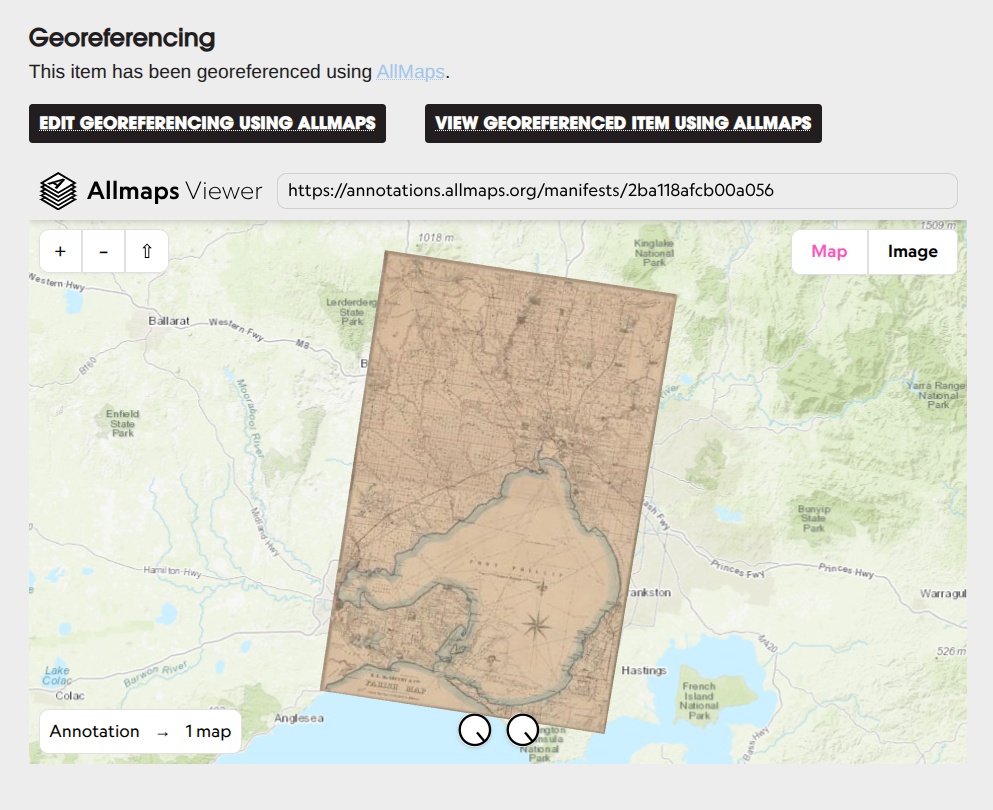 In theory, you don't need the userscript to georeference SLV items in AllMaps. All you need is the url of an item's IIIF manifest. However, there's a couple of problems with the SLV's manifests at the moment, so the userscript feeds them through a proxy service I created to fix the problems before passing the link on to AllMaps.