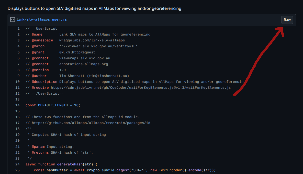 Once your userscript manager is installed, go to my SLV/AllMaps userscript (published as a GitHub Gist). To install the userscript, click on the button at the top of the code box. Your userscript manager will display a window with details of the userscript, and ask you to confirm that you want to proceed. Click 'install' to complete the installation.