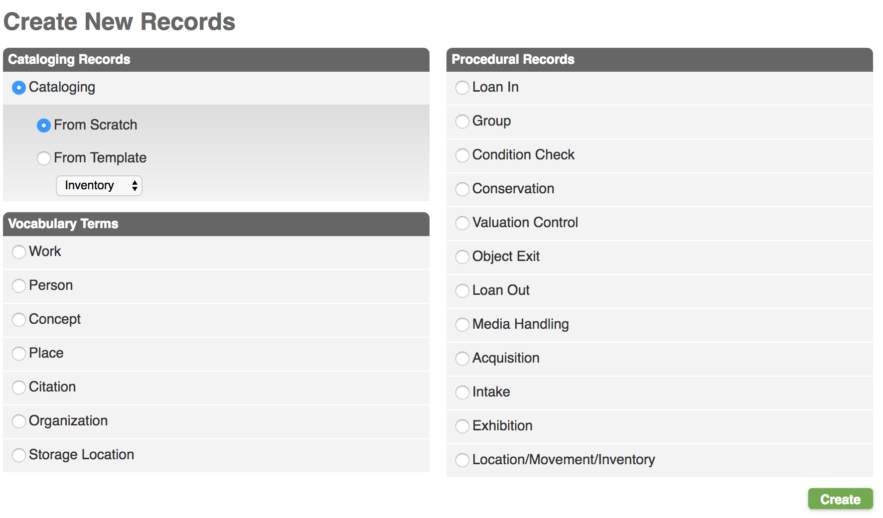 If you click on the ‘Create New’ tab in CollectionSpace you’re given the option to create records in three main categories – ‘Cataloguing Records’, ‘Vocabularly Terms’, and ‘Procedural Records’. The other systems have different names for these sorts of things, but what we’re basically dealing with are: